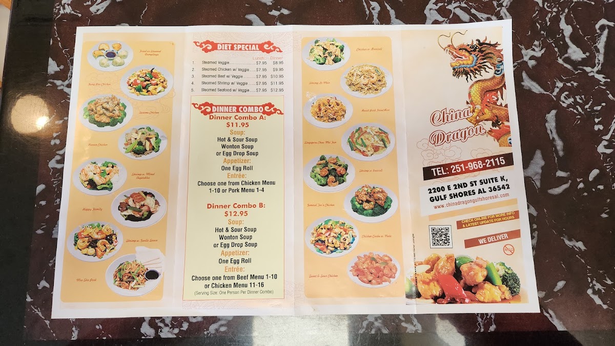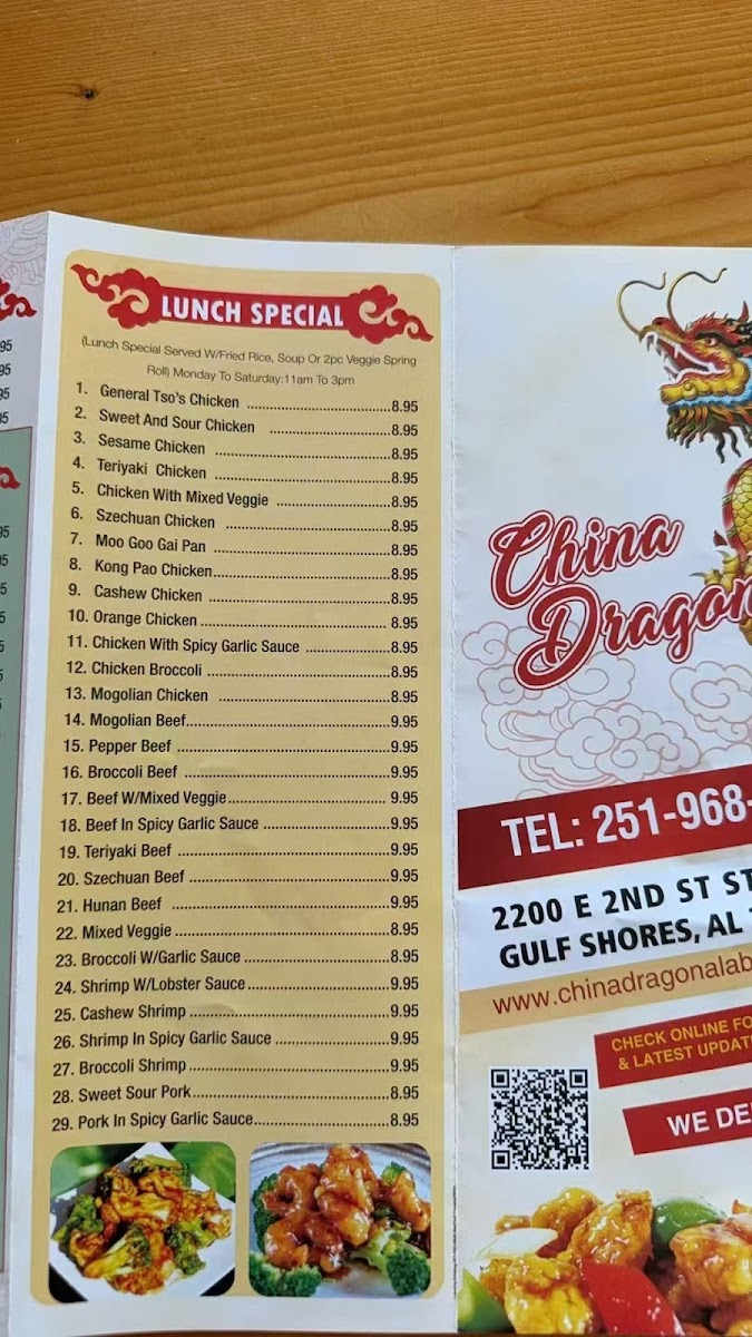 Introducing the menu at China Dragon, a standout Chinese and Asian restaurant nestled in Gulf Shores, AL. Known for generous portions and authentic flavors, China Dragon offers crowd-pleasing dishes like General Tso’s Chicken, Spicy Garlic Chicken, and Orange Chicken that consistently impress locals and newcomers alike. Their pork fried rice, while always satisfying, sometimes leaves room for extra veggies, but it never falls short on taste. Customers praise the balance of bold, deep flavors—a nod to traditional Chinese cuisine that goes beyond the typical Americanized options. The kitchen’s dedication to quality shines through in every bite, whether you order in or opt for delivery. Friendly service and reliable delivery complement the flavorful, hearty meals, making China Dragon a dependable favorite. For those craving spirited, authentic Chinese dishes with a generous portion size, China Dragon delivers an experience that’s both comforting and delicious.
